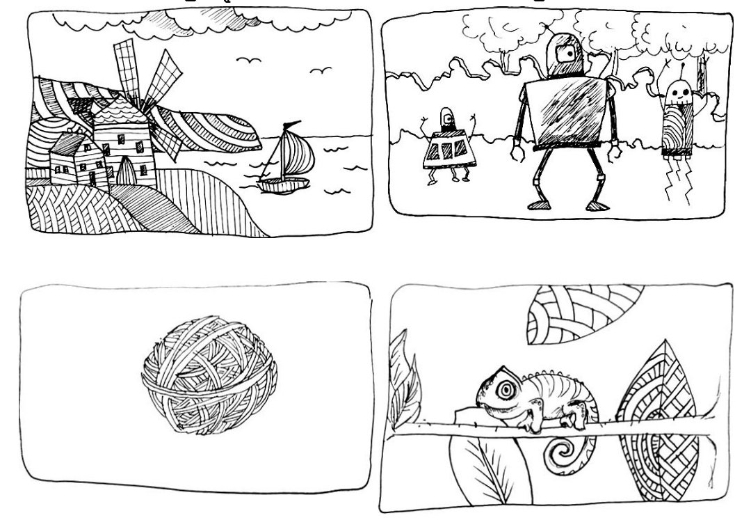 Drop everything and do something with a pathetic black and white chameleon, ball of elastics, and sorrowful robot.