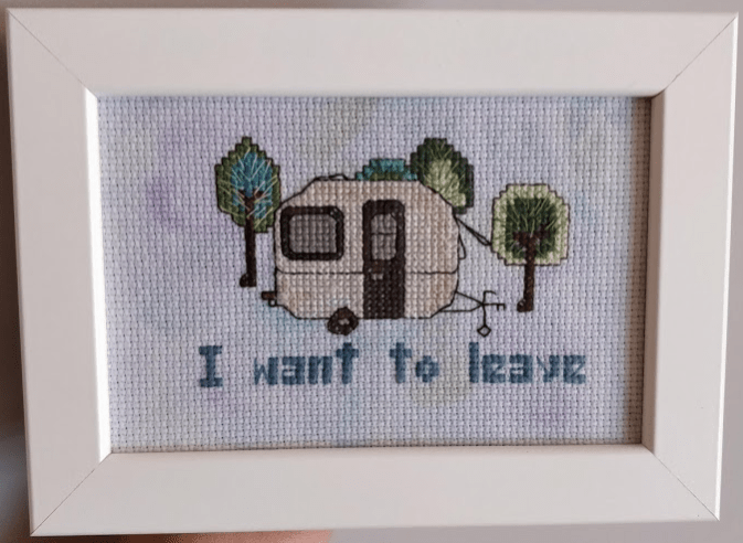 I made this when we first acquired our Little Wee Boler because evidently there’s room inside one of those little guys to accommodate such things as art and craft on top of this family of 4+dog. Besides: what else is there to do while camping if not cross stitch about that camping?