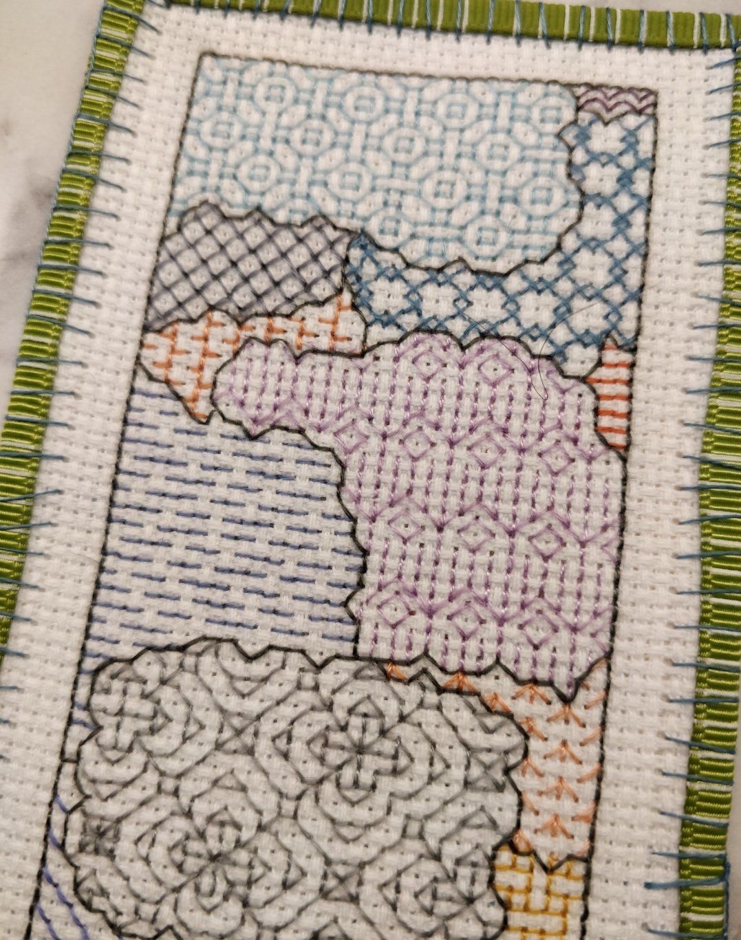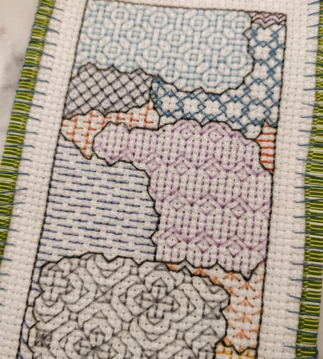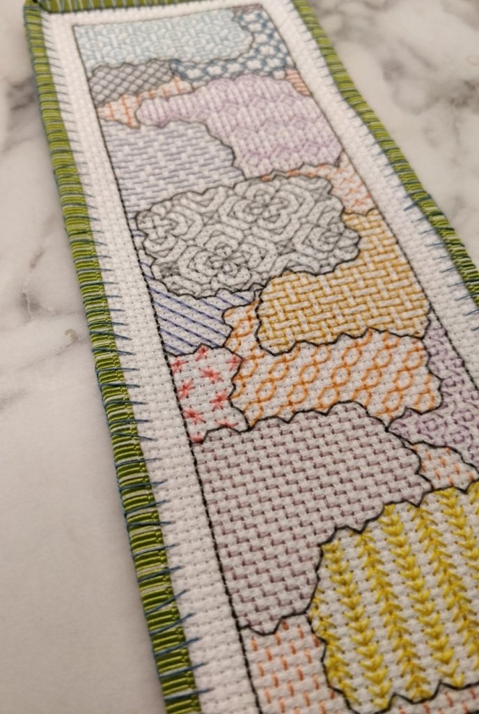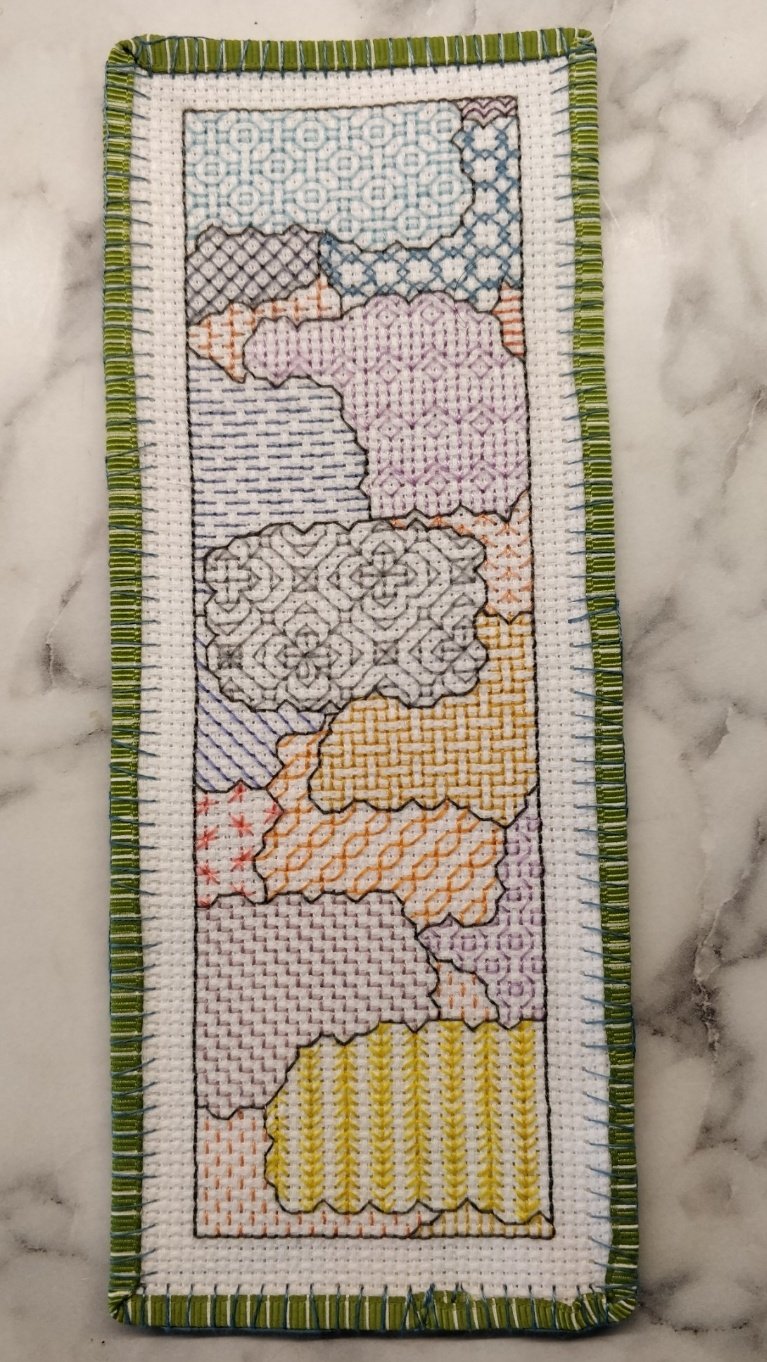 Even more fluffy is taking those two things and forcing them to become each other in a cross stitched bookmark for a friend who (go figure) also likes things like sky. And sheep.