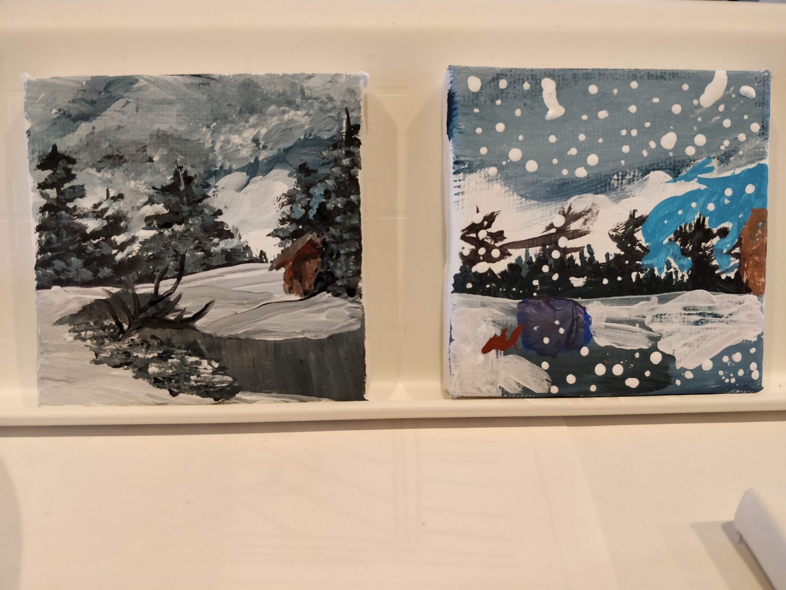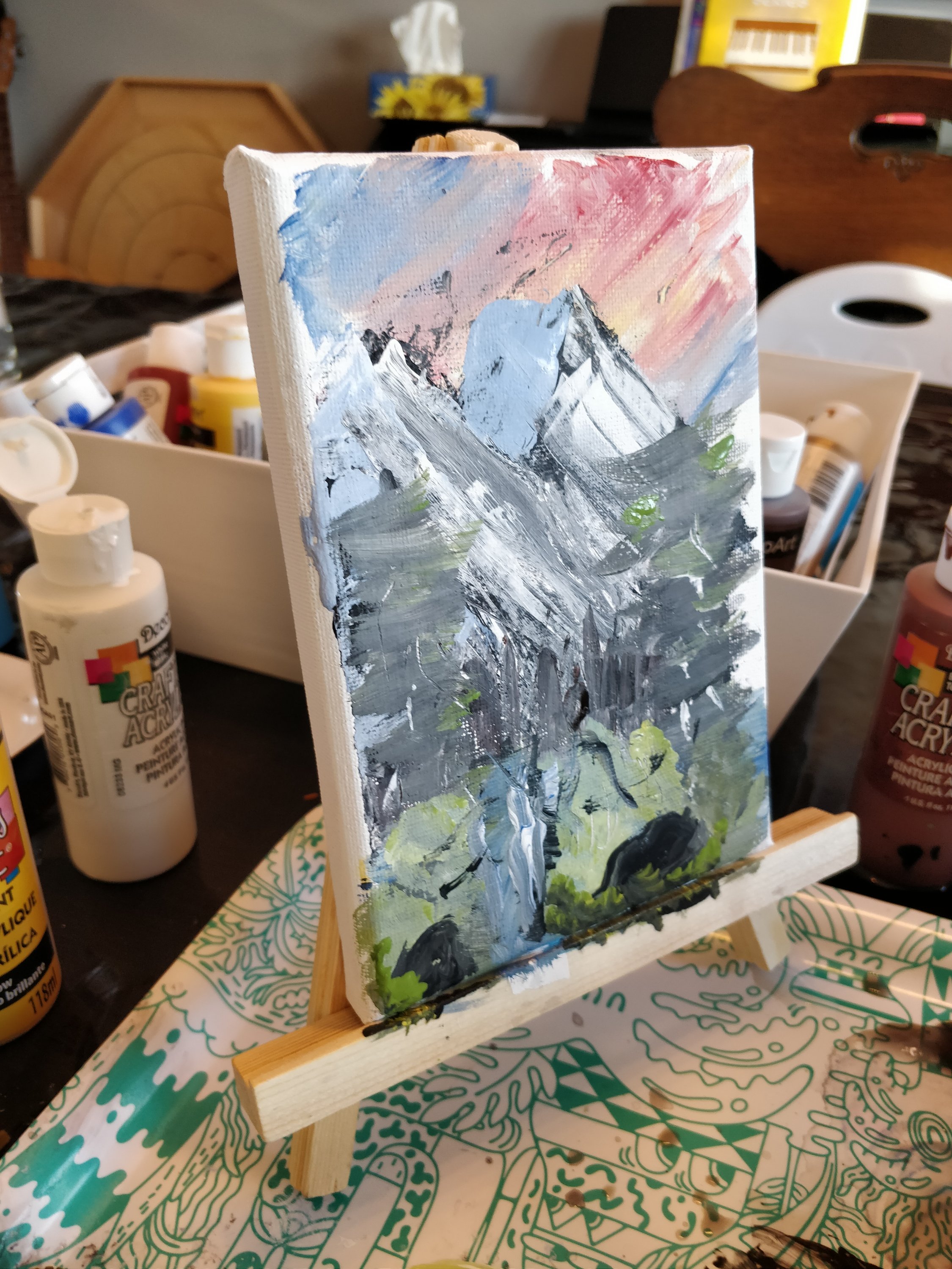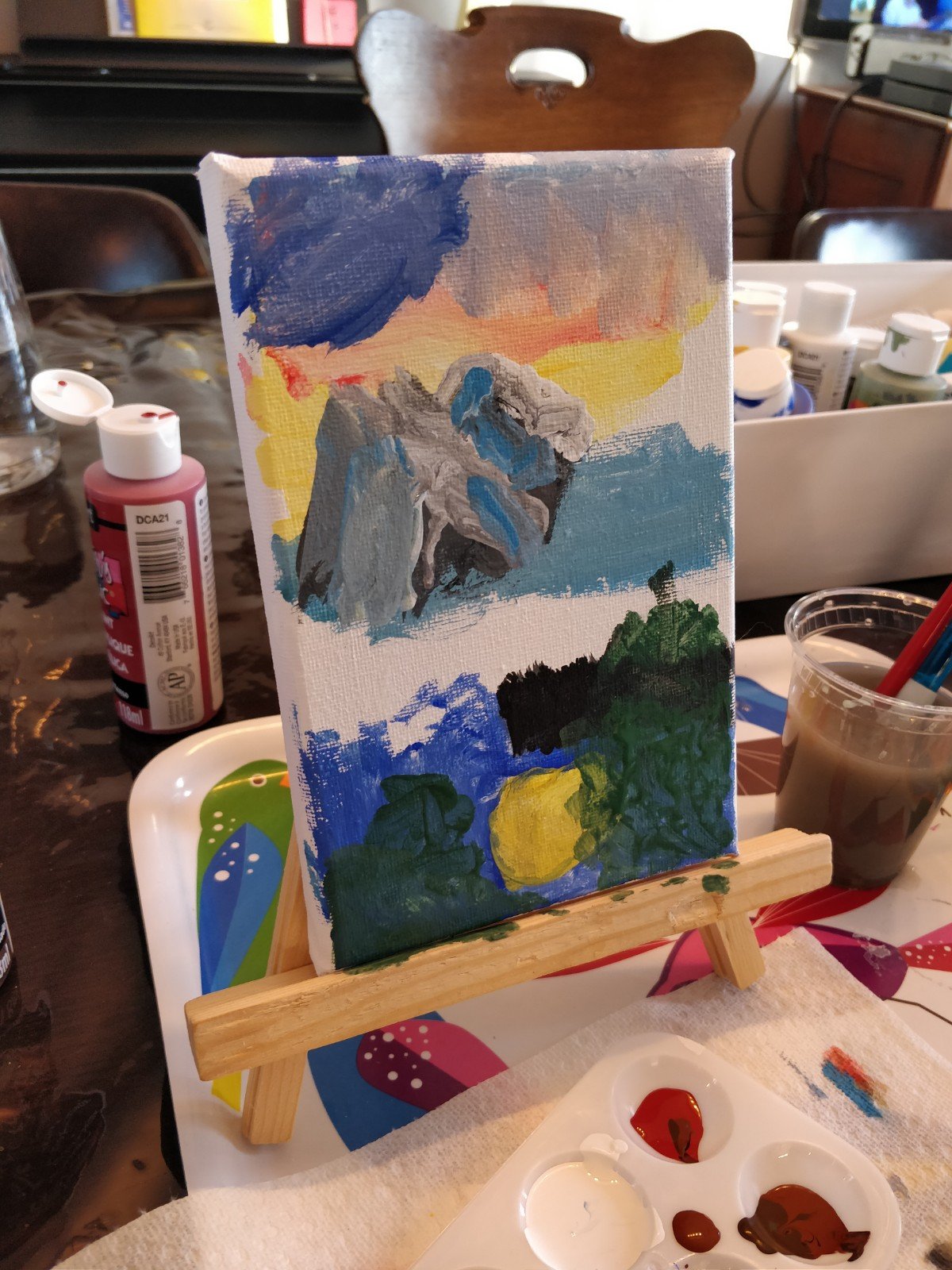 It’s not uncommon around here for my daughter and I (and sometimes others if we can convince them to be willing) to toss on a Bob Ross episode and make a mess. These are the results of those messes.